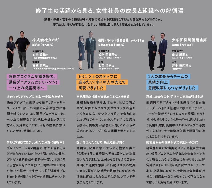 交流会ではWBC修了生を迎え、修了後の成長イメージを確立し、受講意欲を後押しします。